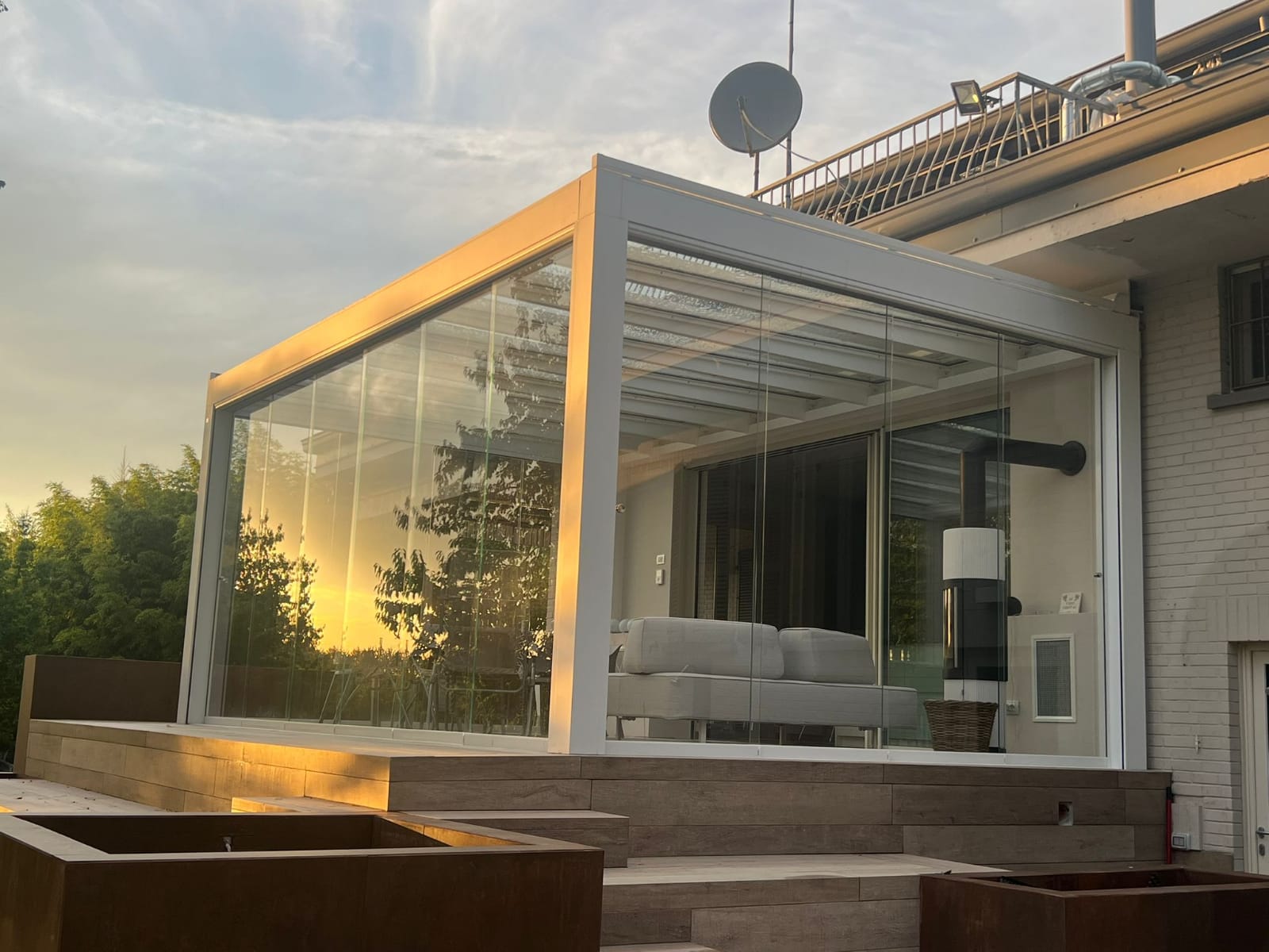 Una soluzione semplice per sfruttare il cortile anche in caso di mal tempo? La combinazione perfetta tra la PERGOTENDA LEVEL, con tetto in PVC apribile e richiudibile a pacchetto, unita alla TENDA A SCORRIMENTO VERTICALE SQUARE, in tessuto PVC CRISTAL trasparente. Level
